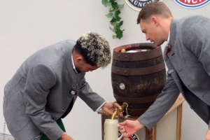 24直播网4月24日讯 拜仁官方更新社媒动态,晒出诺伊尔、迪亚斯接啤酒的视频。