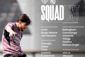 24直播网4月24日讯 北京时间明天凌晨,皇马将在西甲第32轮比赛中客场对阵贝蒂斯,皇马公布了此役的球员名单。米利唐、琼阿梅尼、居莱尔、塞巴略斯缺席,阿森西奥回归。
