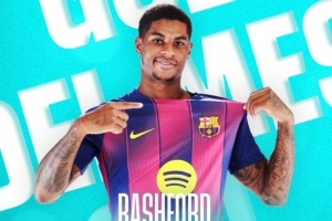 在西甲第31轮,巴萨4-1击败西班牙人,第88分钟,德容禁区右路挑传后点拉什福德凌空端射破门,这粒进球也被评选为本月联赛最佳进球。