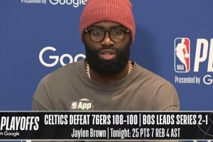 24直播网4月25日讯 NBA季后赛首轮G3,凯尔特人108-100战胜76人,大比分2-1领先,赛后布朗接受了媒体采访,以下为采访全文。