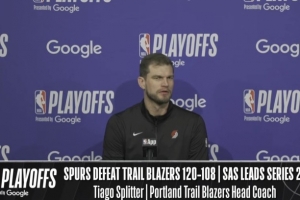 24直播网4月25日讯 NBA季后赛,开拓者108-120不敌马刺,大比分1-2落后。赛后斯普利特接受了媒体采访,以下为采访全文。