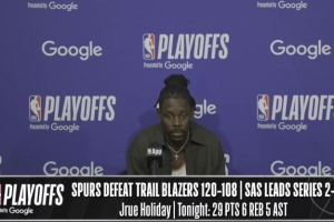 24直播网4月25日讯 NBA季后赛,开拓者108-120不敌马刺,大比分1-2落后。赛后朱·霍勒迪接受了媒体采访,以下为采访全文。