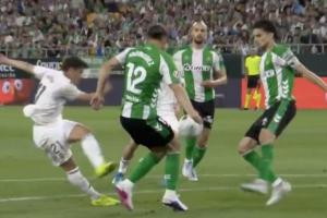 24直播网04月25日讯 西甲第32轮,皇马客战贝蒂斯,第26分钟,迪亚斯禁区内打门,贝蒂斯疑似手球犯规未判点球。