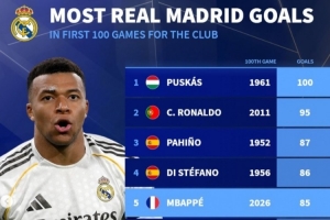 24直播网4月25日讯 皇马在本轮西甲1-1遭贝蒂斯绝平,姆巴佩首发出战,解锁个人皇马生涯100场里程碑。《转会市场》也统计了皇马球员百场进球榜。