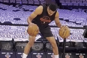 24直播网4月23日讯 近日,老鹰球员CJ·麦科勒姆赛前在场边练习控运。