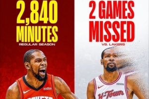 “凯文·杜兰特在常规赛中打了78场比赛,却眼睁睁看着它可能以这样的方式结束......火箭队现在对湖人队以0–3落后,再输一场就是被横扫了,这一场比以往任何时候都更令人痛心——杜兰特常规赛打了78场,总上场时间联盟第二(2840分钟,队友阿门第一)。 这是他自2019年以来他最健康的一个赛季。而现在呢?当聚光灯更亮时,他却因伤无法出战,火箭完全就缺少那个让一切都运转起来的家伙。这会是凯文·杜兰特迄今为止最令人沮丧的赛季吗?”“Clutchpoints”写道。