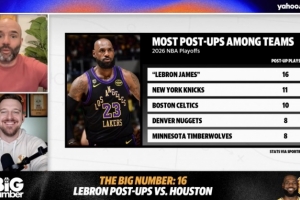 24直播网4月23日讯 据雅虎体育统计,湖人球星在对阵火箭的系列赛前两场执行背身单打的次数,已经超过了截止目前季后赛其他所有球队的背身单打次数。