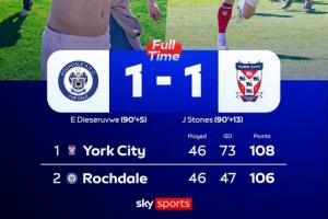 24直播网04月25日讯 英格兰全国联赛(第5级别)最后一轮,帮榜首球队直接交锋上演神剧情,罗奇代尔第95分钟绝杀,约克城第103分钟绝平,约克城升入英乙,赛季取得106分的罗奇代尔只能去参加残酷的附加赛。