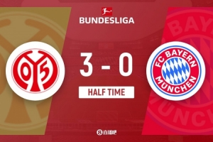 上半场补时第3分钟,美因茨反击迅速简洁,阿米里抽射被乌尔比希勉力扑出,贝克尔补射得手!美因茨3-0拜仁慕尼黑!↓