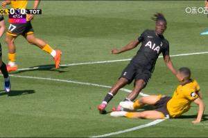 24直播网04月25日讯 英超第34轮,热刺客战狼队。比赛上半场补时阶段,狼队中场特林达德飞铲连人带球放倒比苏马,主裁判泰勒向特林达德出示黄牌。