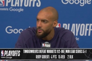 24直播网4月26日讯 在今天结束的一场季后赛中,森林狼以112-96战胜掘金。赛后,森林狼球星鲁迪·戈贝尔出席了新闻发布会。以下是完整版采访内容。