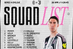 24直播网4月26日讯 北京时间明天凌晨,尤文将在意甲第34轮比赛中客场对阵米兰,尤文公布了此役的球员名单。佩林、弗拉霍维奇、阿季奇回归。
