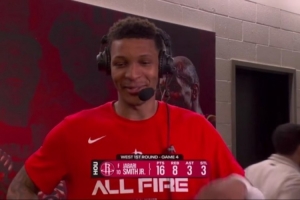 24直播网4月27日讯 在今天结束的一场季后赛中,火箭以115-96战胜湖人。赛后,火箭球员小贾巴里·史密斯接受了媒体的采访。以下是完整版采访内容。