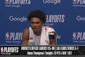 24直播网4月27日讯 在今天结束的一场季后赛中,火箭以115-96战胜湖人。赛后,火箭球员阿门·汤普森出席了新闻发布会。以下是完整版采访内容。