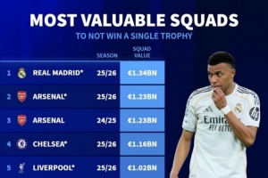 24直播网4月27日讯 德国转会市场列出了无冠球队身价排名,如果皇马、阿森纳本赛季无缘冠军,将排名前两位。