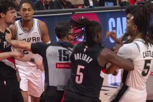 末节2分13秒,马刺后卫卡斯尔上篮打进2+1后将球按在开拓者前锋阿夫迪亚胸口上,引起后者不满,最终双方爆发冲突。