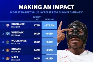 24直播网4月28日讯 德国转会市场列出了去年夏窗签约球员身价上涨排名,扬··迪奥曼德上涨7350万欧居首、武什科维奇上涨4800万欧次席。