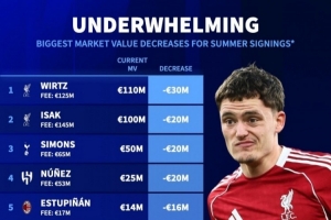 24直播网4月28日讯 德国转会市场列出了去年夏窗签约球员身价下跌排名,维尔茨下跌3000万欧最多,伊萨克、西蒙斯、努涅斯下跌2000万欧。