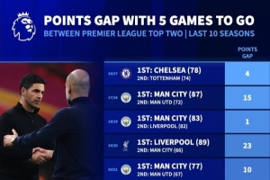 24直播网4月23日讯 德国转会市场盘点了英超近10个赛季还剩最后5轮比赛时的前两名球队分差,本赛季0分最少。