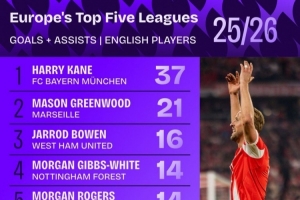 本赛季英格兰球员五大联赛参与进球榜(仅统计联赛)