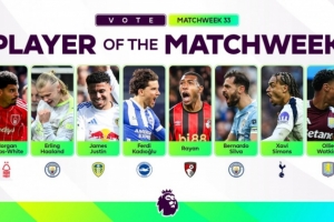 24直播网4月23日讯 今天,英超联赛在官网公布了2025/26赛季英超第33轮最佳球员候选,哈兰德、B席、沃特金斯等8位球员在列。