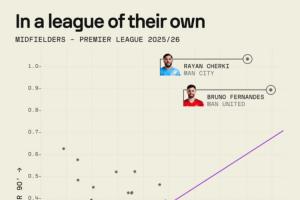 24直播网04月23日讯 sofascore统计了每90分钟创造的机会和进球/助攻比,谢尔基和B费断档领先,没有其他中场球员更接近。