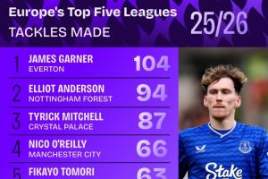 24直播网04月23日讯 数据机构squakwa统计了本赛季至今五大联赛英格兰球员铲球次数榜,加纳居首,安德森位列次席,曼城的奥赖利和阿森纳赖斯在列,米兰的托莫里和里昂的奈尔斯是本榜单中非英超联赛的球员。