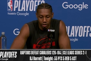 24直播网4月24日讯 季后赛G3,猛龙主场126-104大胜骑士,将大比分扳为1-2。赛后巴雷特接受了采访,以下为采访全文。